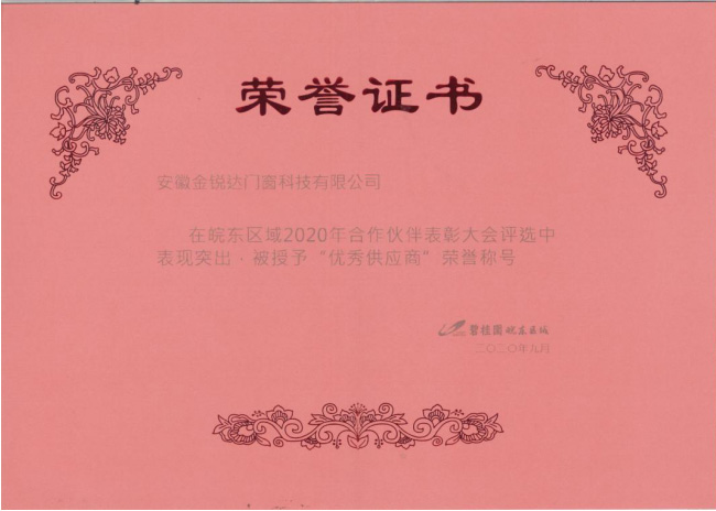 熱烈祝賀我司榮獲碧桂園皖東區(qū)域2020年“優(yōu)秀供應(yīng)商”榮譽(yù)稱號