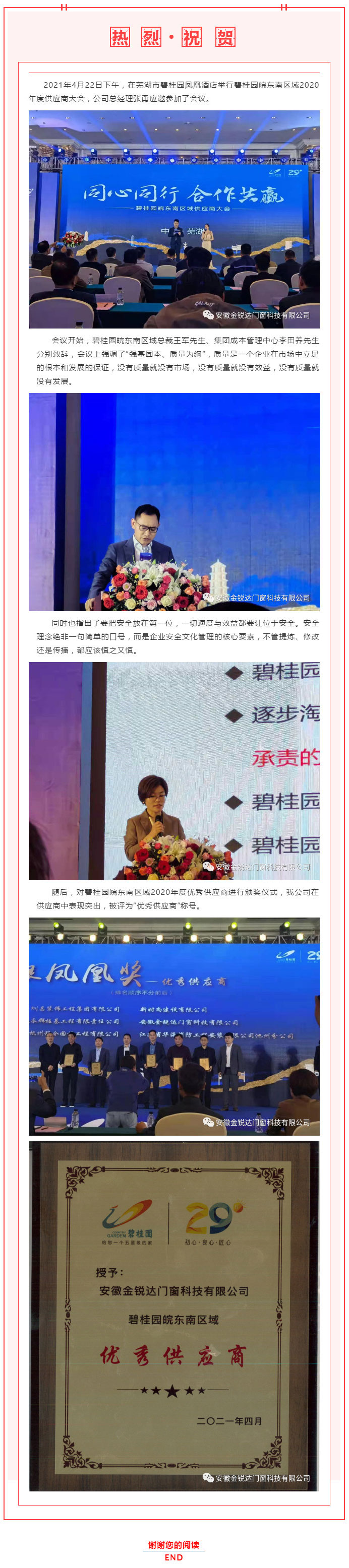 熱烈祝賀我司榮獲碧桂園皖東南區(qū)域“優(yōu)秀供應(yīng)商”榮譽稱號