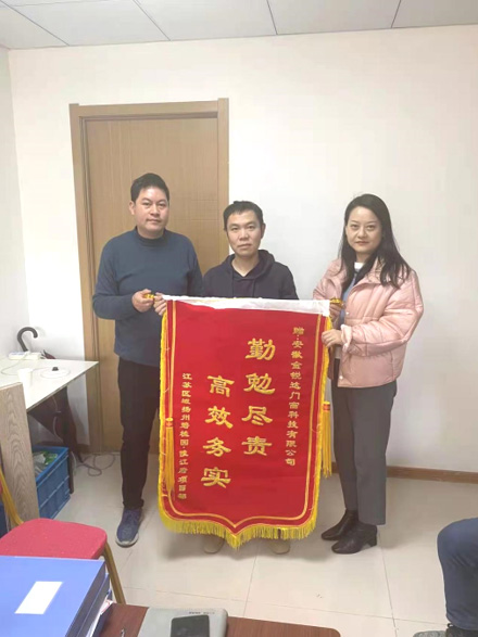 2022年2月25日,碧桂園江蘇區(qū)域揚(yáng)州碧桂園陵江府項(xiàng)目部向我公司贈送錦旗,錦旗上書“勤勉盡責(zé)高效務(wù)實(shí)”,對我公司為項(xiàng)目部提供及時有效的售后服務(wù)表示感謝。